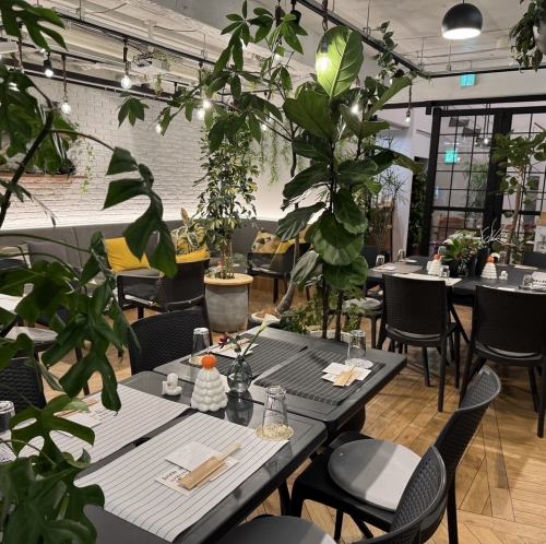 【ガーデンのような落ち着いた雰囲気】緑に囲まれた心地よい店内でヘルシーな料理を楽しめる、女子会にもぴったりな空間です★